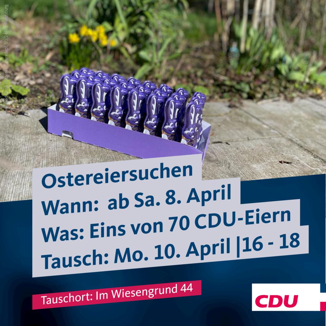 Das Osterwochenende steht vor der Tür und die Vorbereitungen für das Ostereisuchen sind abgeschlossen. Wir werden am Samstag 70 CDU Ostereier übers Dorf verteilt in Groß Wittensee verstecken. Das von euch gefundene Ei könnt ihr dann am Ostermontag (10.04) zwischen 16 und 18 Uhr bei Karola Blunck (Im Wiesengrund 44 in Groß Wittensee) gegen ein Schokohasen eintauschen. Bitte nehmt jeweils nur ein Ei mit damit möglichst viele Kinder an dem Eiersuchen Teilnehmen können. Den Startschuss wann es los gehen kann, teilen wir euch am Samstag hier noch mit.